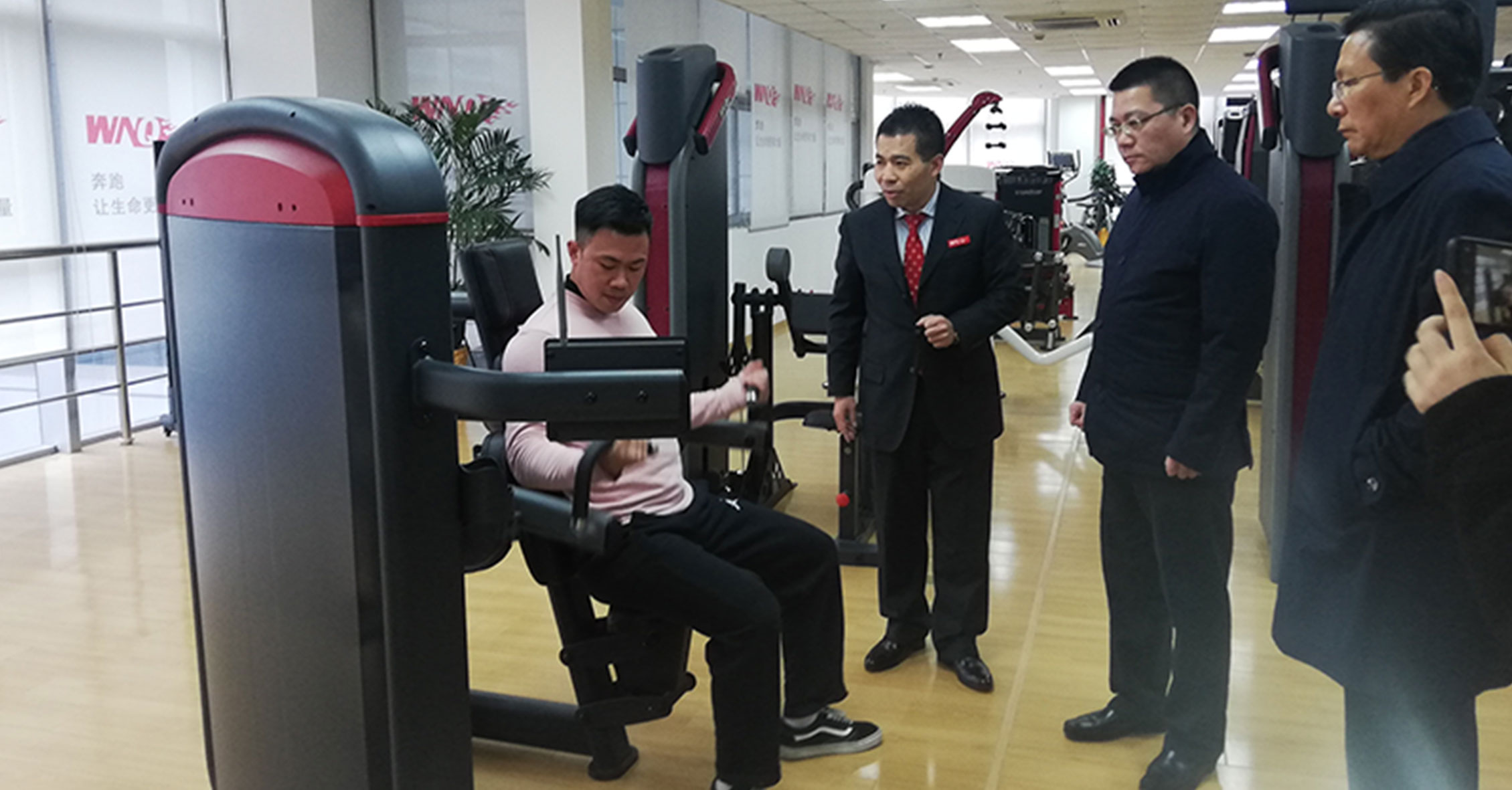 许副局长一行先参观了z6.com器材展厅,对我们的企业文化、发展情况、健身器材产品等进行了详细了解,并重点关注了2018年z6.com推出的F1-7000美格力量单站系列、W2000变形金刚系列和F4、F6跑步机等新品,z6.com的力量单站产品大管径的优质选材、源自美国的外形设计和新品跑步机的智能化等特点深得领导一行的肯定。